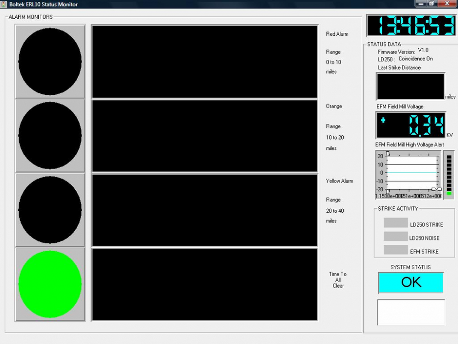 The ERL-10 Status Monitor software (included) allows the system status and countdown timers to be displayed. Countdown timers clearly indicate the number of minutes until All Clear. Alarm activations are timestamped and logged to disk. Graphical log file viewing software is also included.