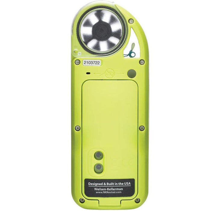 Wind Speed | Air Speed Larger of 3% of reading, least significant digit or 20 ft/min Speed 0.1 m/s 1 ft/min 0.1 km/h 0.1 mph 0.1 knots 1 B* 0.1 F/S* 0.6 to 40.0 m/s 118 to 7,874 ft/min 2.2 to 144.0 km/h 1.3 to 89.5 mph 1.2 to 77.8 knots 0 to 12 B* 2-131.2* 1 inch|25 mm diameter impeller with precision axle and low-friction Zytel® bearings. Startup speed stated as lower limit, readings may be taken down to 0.4 m/s |79 ft min|1.5 km/h |.9 mph |.8 kt after impeller startup. Off-axis accuracy -1% @ 5º off axis; -2% @ 10º; -3% @ 15º. Calibration drift < 1% after 100 hours use at 16 MPH|7 m/s. Replacement impeller (NK PN-0801) field installs without tools (US Patent 5,783,753). Wind speed calibration and testing should be done with triangle on impeller located at the top front face of the Kestrel. Measuring wind speeds above 60 m/s / 134.2 mph can damage the impeller