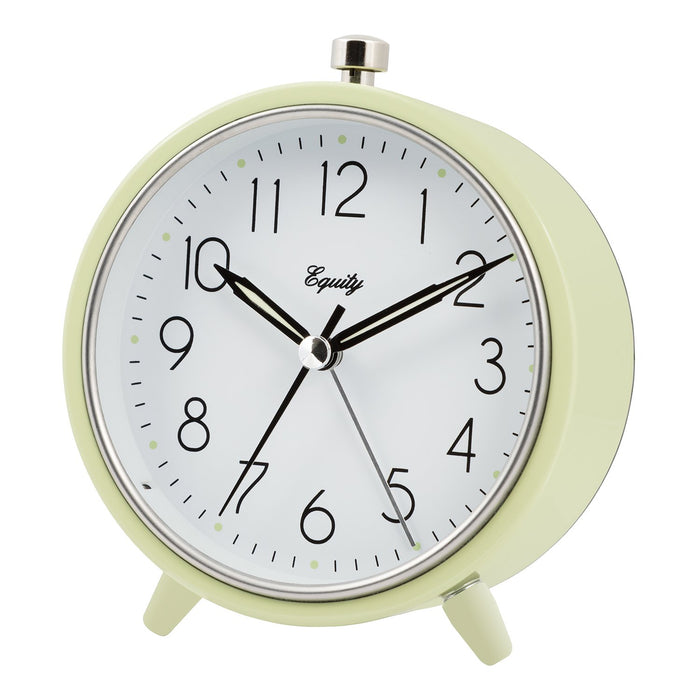 For a smooth, sophisticated look in a compact clock, keep time with the LaCrosse Technology 20090 analog quartz alarm clock. With the convenience of an easy-to-view illuminated metal hands and hour dots and a comfortable glass lens, you'll never oversleep. This metal frame clock also features a quiet hand sweeping time movement, allowing you to concentrate on the time without having to hear ticking.