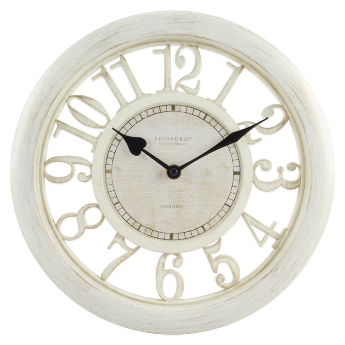 Numerous decorative features, such as glass lens, antiqued white case, floating dial, and more do the trick. The feature-filled design of this wall clock will transform the ordinary into the extraordinary!