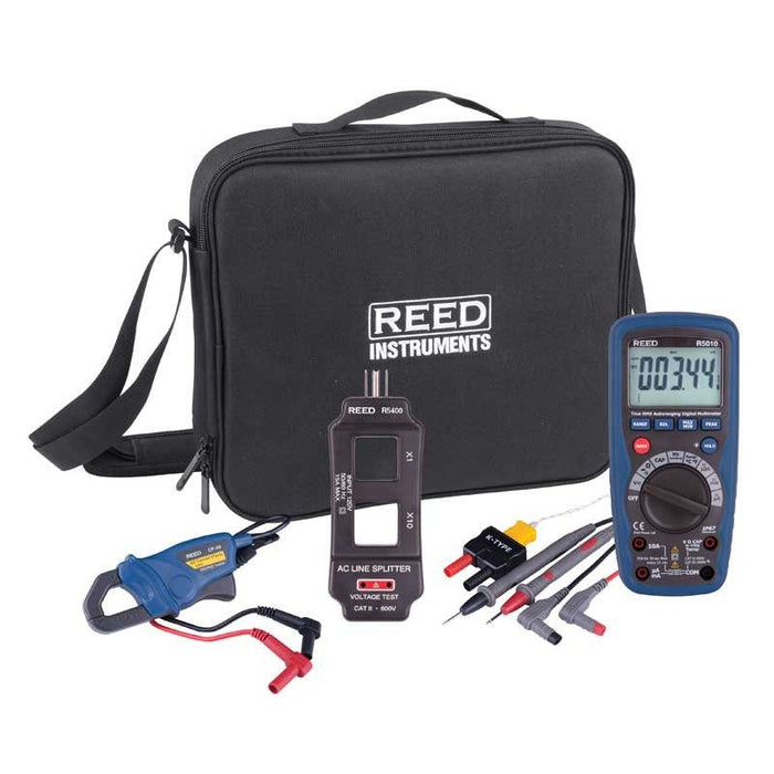 This all-in-one electricians combo kit includes a multimeter, temperature input adapter, type K thermocouple, safety test leads, fused test leads, AC current adapter, AC line splitter and carrying case.