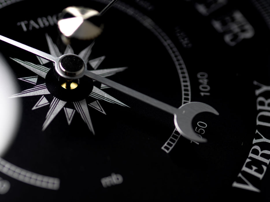 With up to the minute weather predictions, you will always know whether to grab your jumper before venturing outside with this Tabic Clocks handmade Prestige barometer in chrome with jet black dial mounted on an English oak mantel/display mount.
