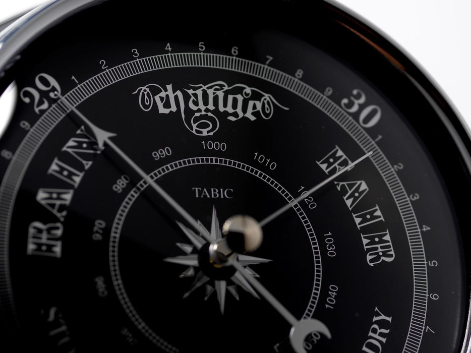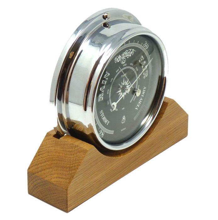 Tabic Clocks Handmade Prestige Barometer in Chrome with Jet Black Dial Mounted on an English Oak Mantel/Display Mount