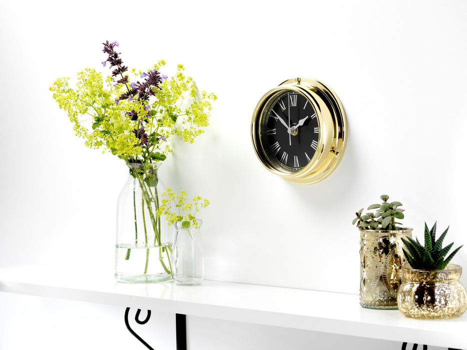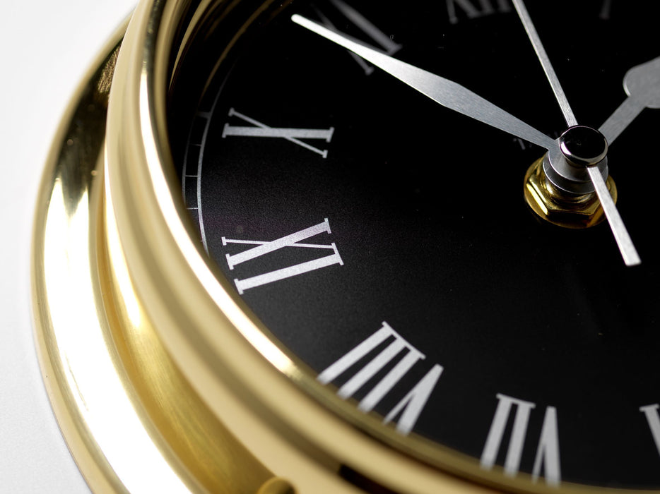 This clock is made using a heavy six inch flat polished brass case, with a rubber seal and flat glass front. Accompanied by a jet black dial and chrome hands, the clock gives a truly stunning look.