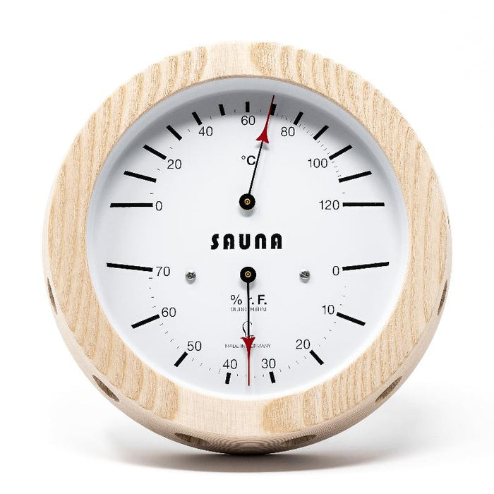Hair-Hygrometer synthetic, combined with bimetal thermometer to measure humidity and temperature in the sauna.